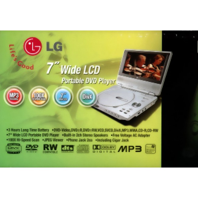 Portable dvd player of 7" with build in 2 inch stereo speakers, free voltage ac adapter, 100X Hi-speed scan, phone jack 2 inch, including cigar jack